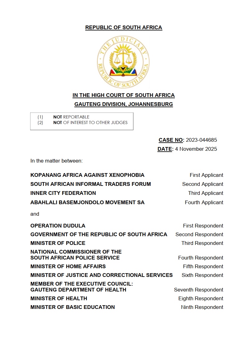 Application for interdictory and declaratory relief against Operation Dudula and against the Government of South Africa – section 41 of the Immigration Act 13 of 2002 – application for declarator that only Immigration Officials and Police Officers have the power to demand identification from persons – Operation Dudula interdicted from demanding that any private person produce identification – application for declarator that SAPS breached its constitutional duties to combat and investigate crime and to uphold and enforce the law refused – Operation Dudula also interdicted from unlawful conduct and conduct which amounts to them taking the law into their own hands and hate speech.